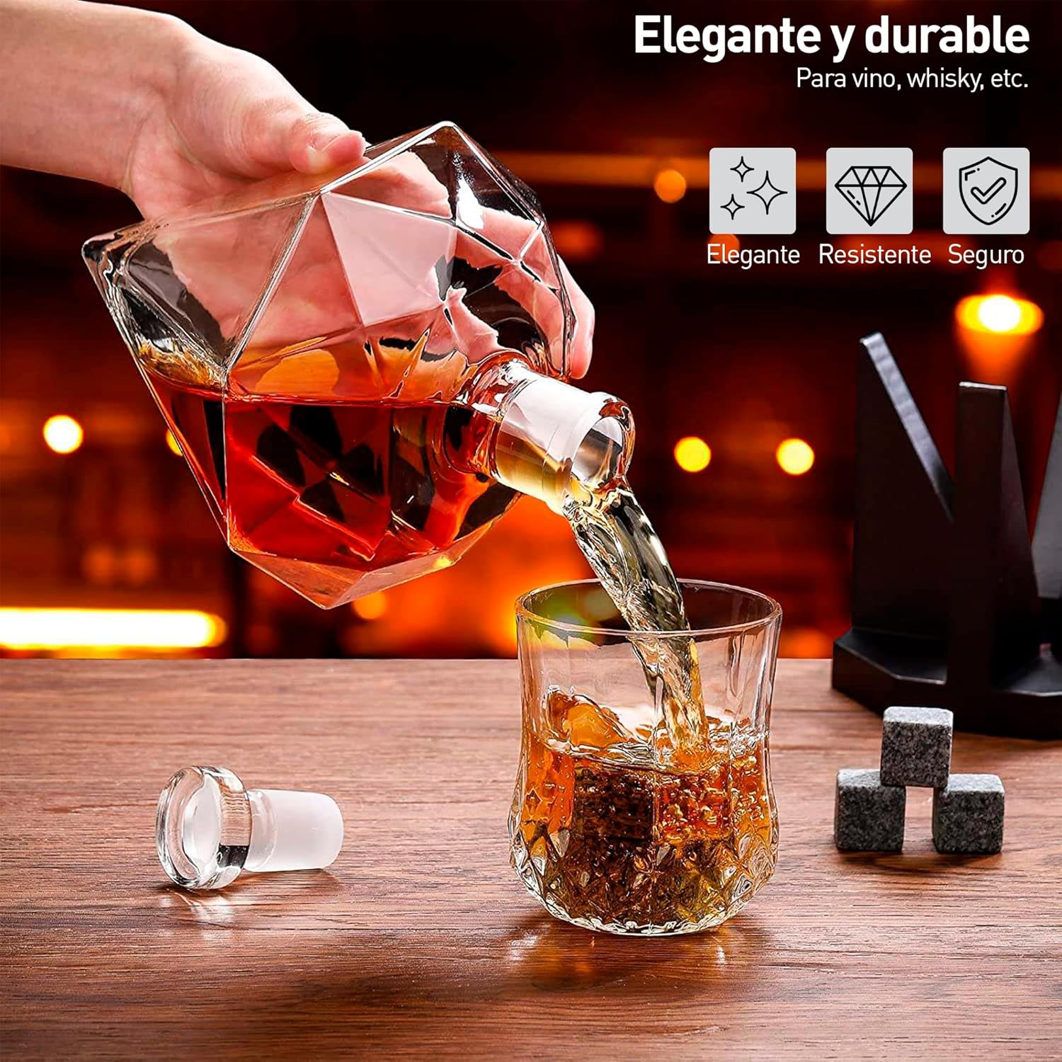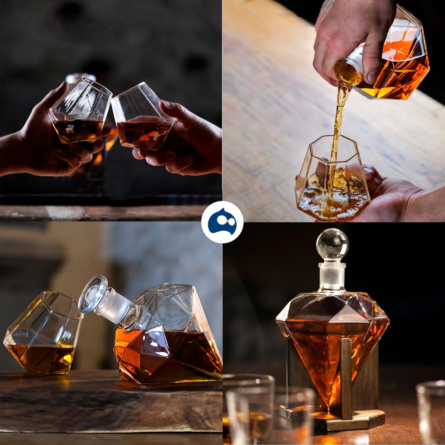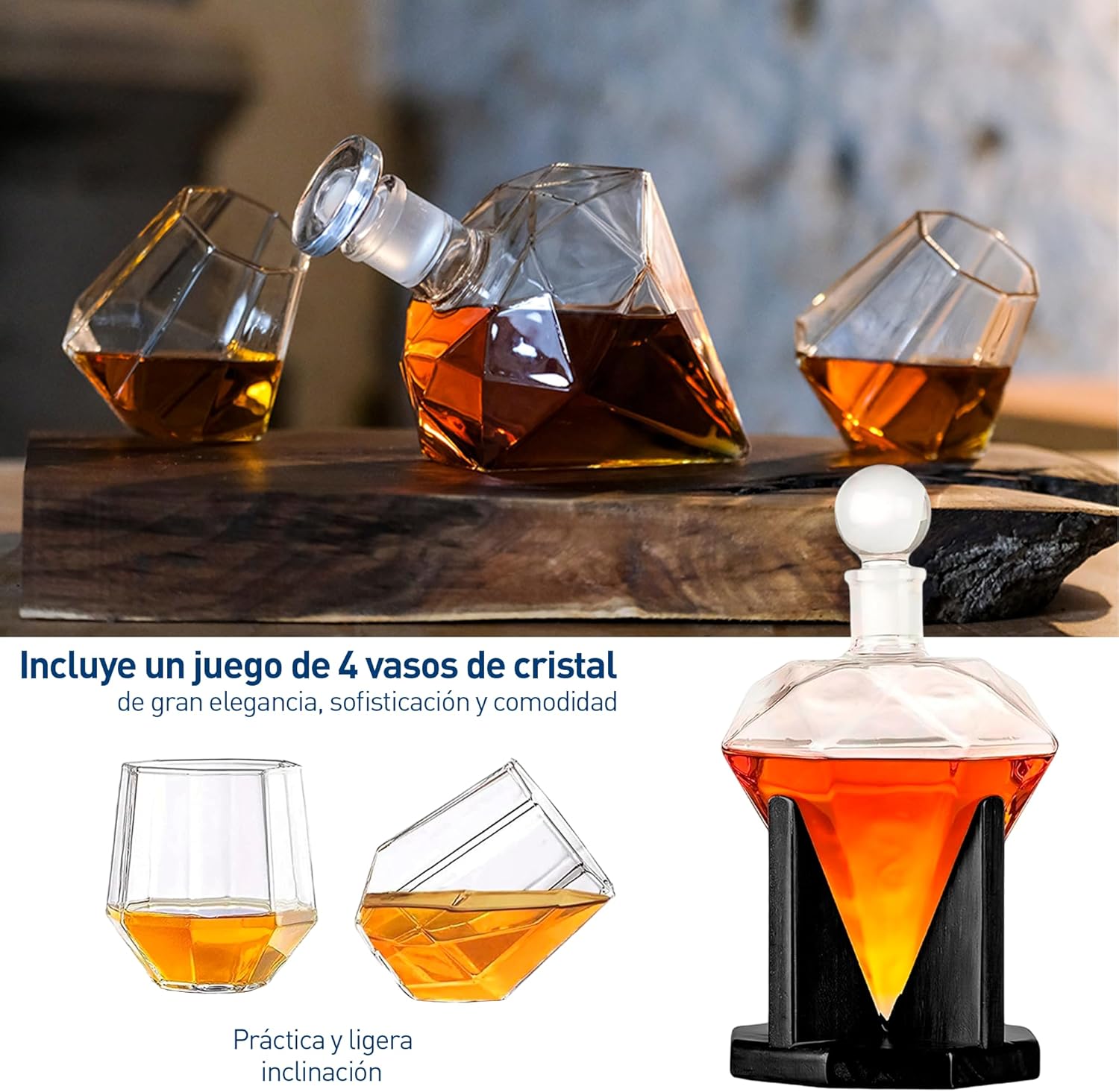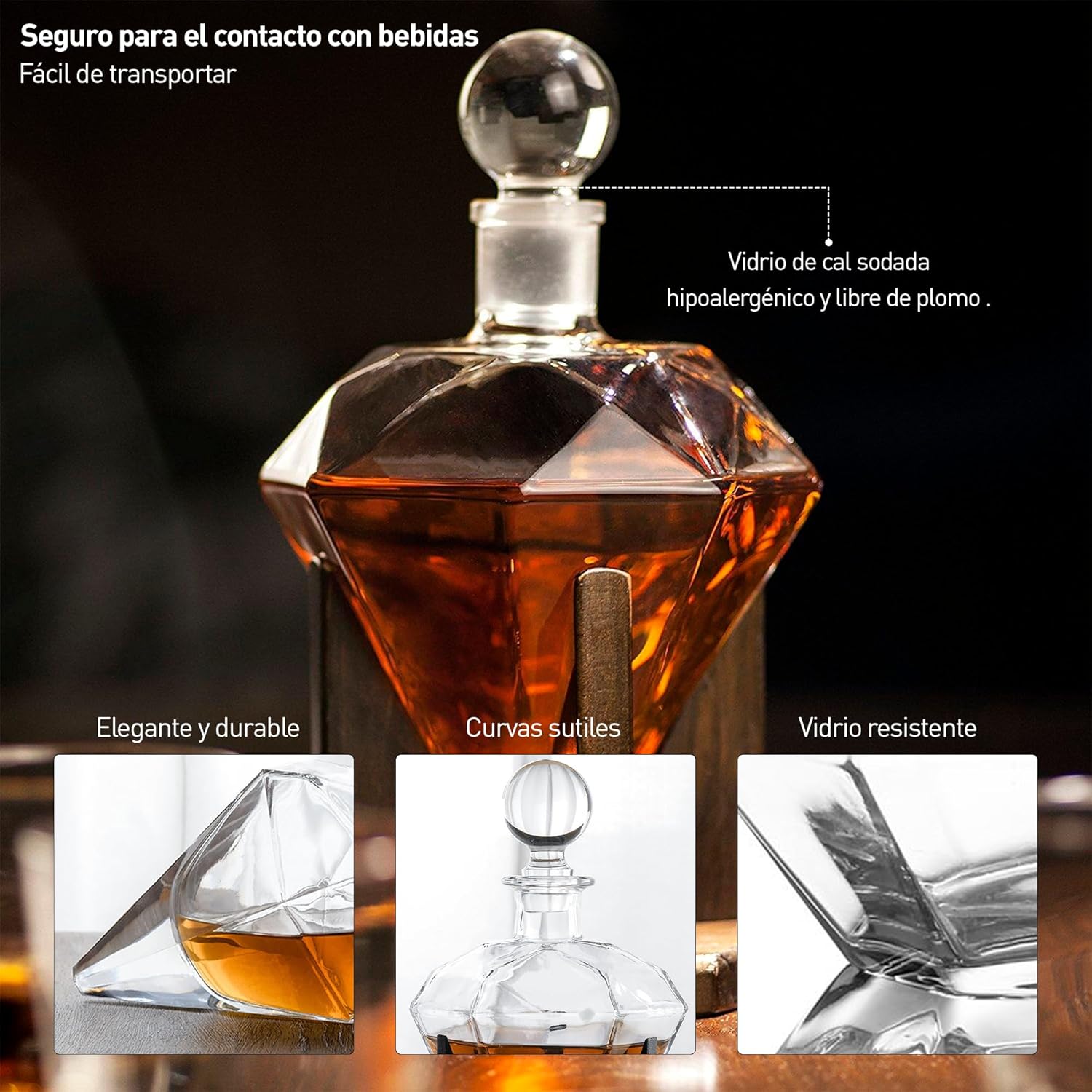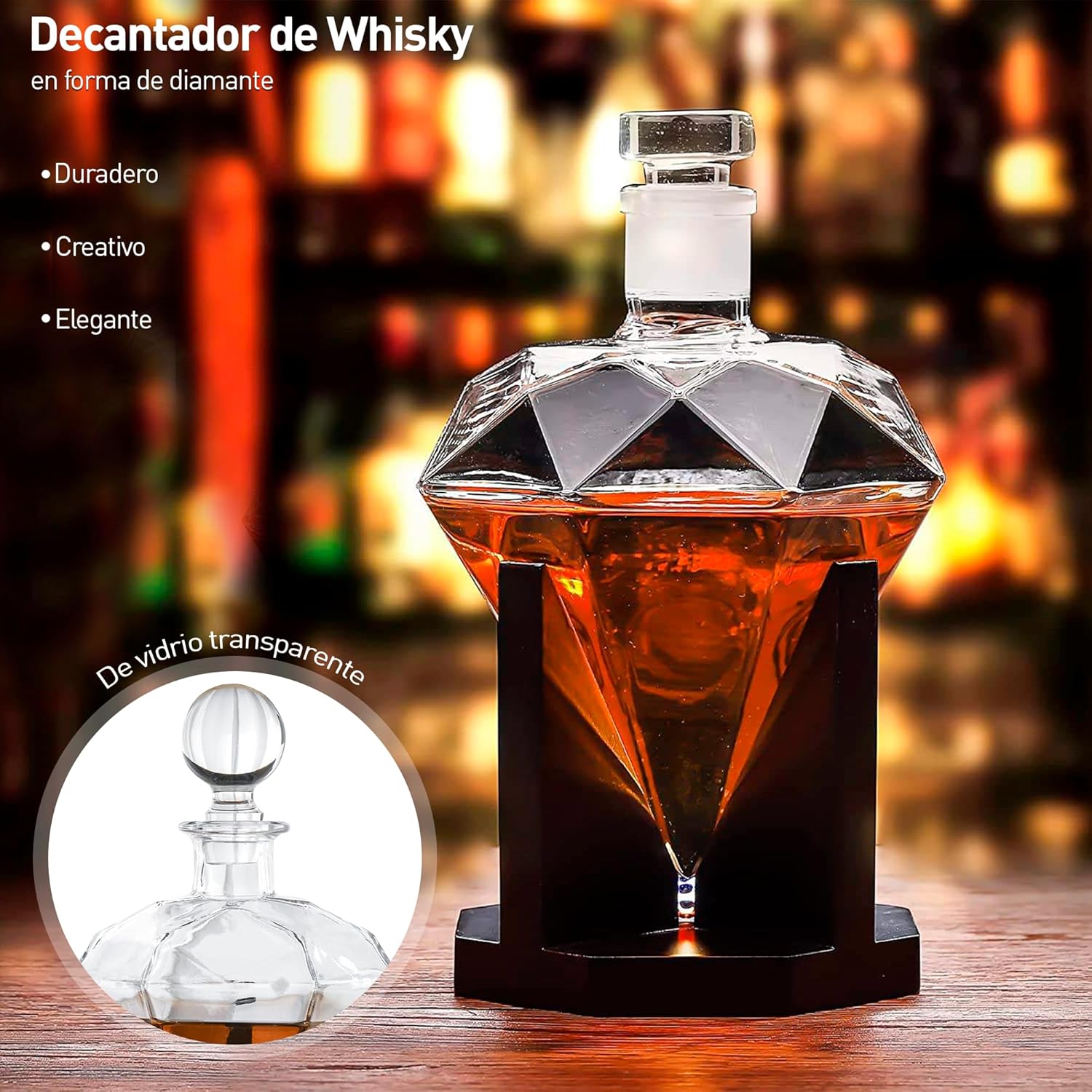 Decantador de Whisky en Forma de Diamante — Vidrio Soplado + Bandeja de Madera