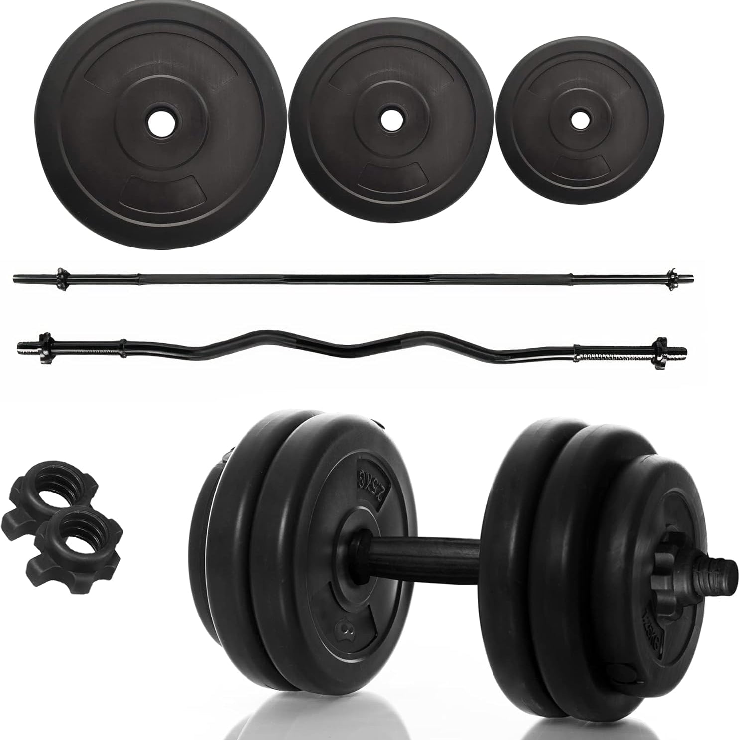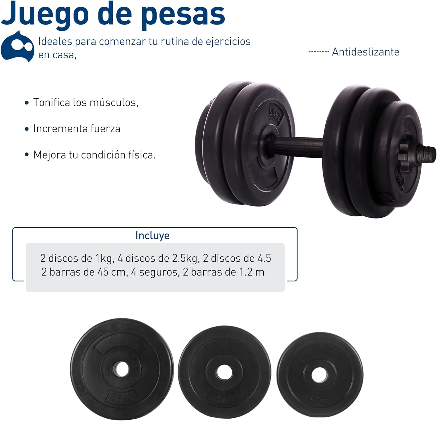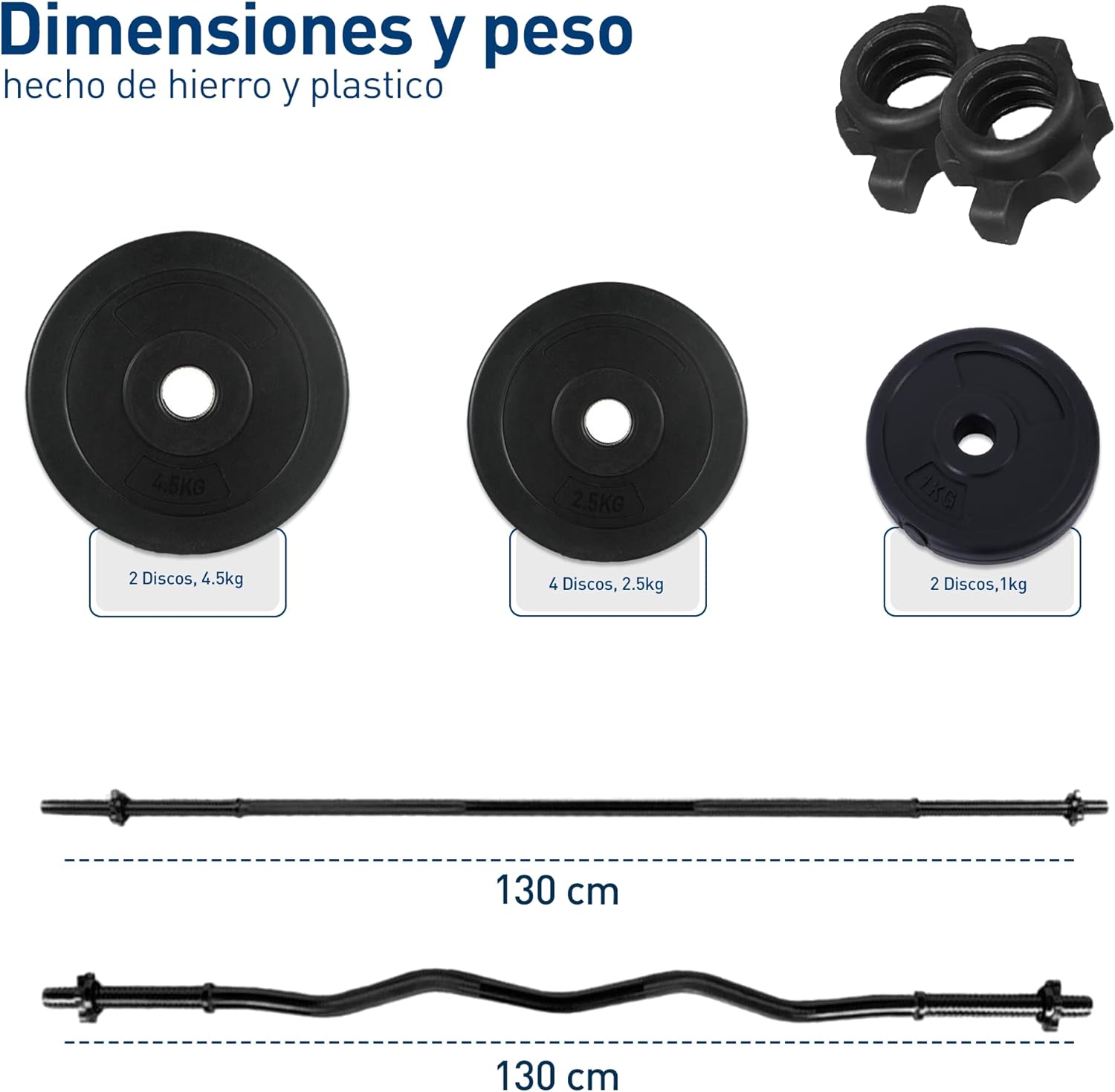 🔹 Set Completo: 8 discos (2.5 kg, 4.5 kg y 1 kg), 2 mancuernas y 2 barras (recta y Z).