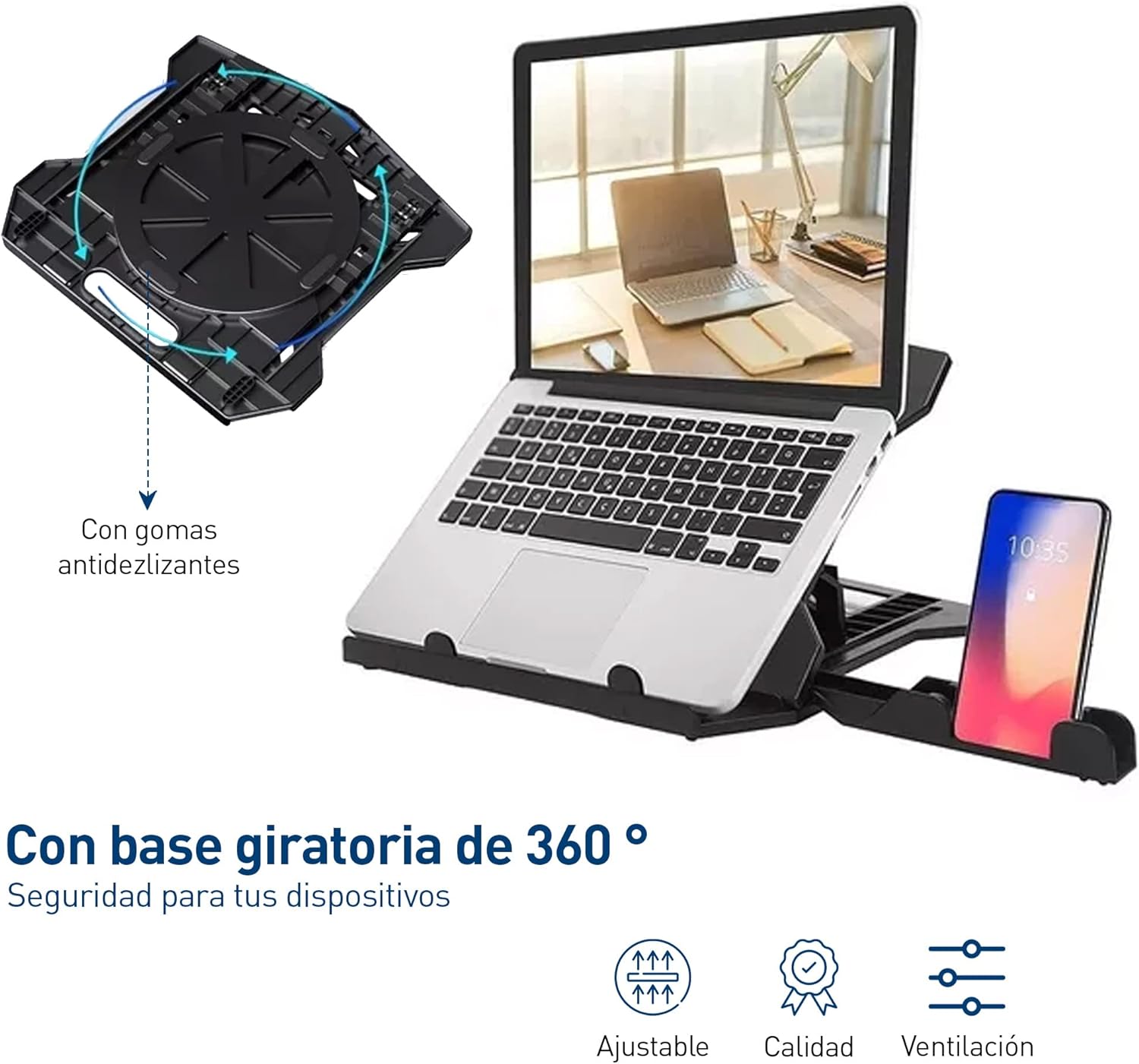 📏 Medidas o capacidad: Compatible con laptops de 10” a 17”; incluye soporte desmontable para celular; base giratoria 360° y 8 niveles de altura ajustable.