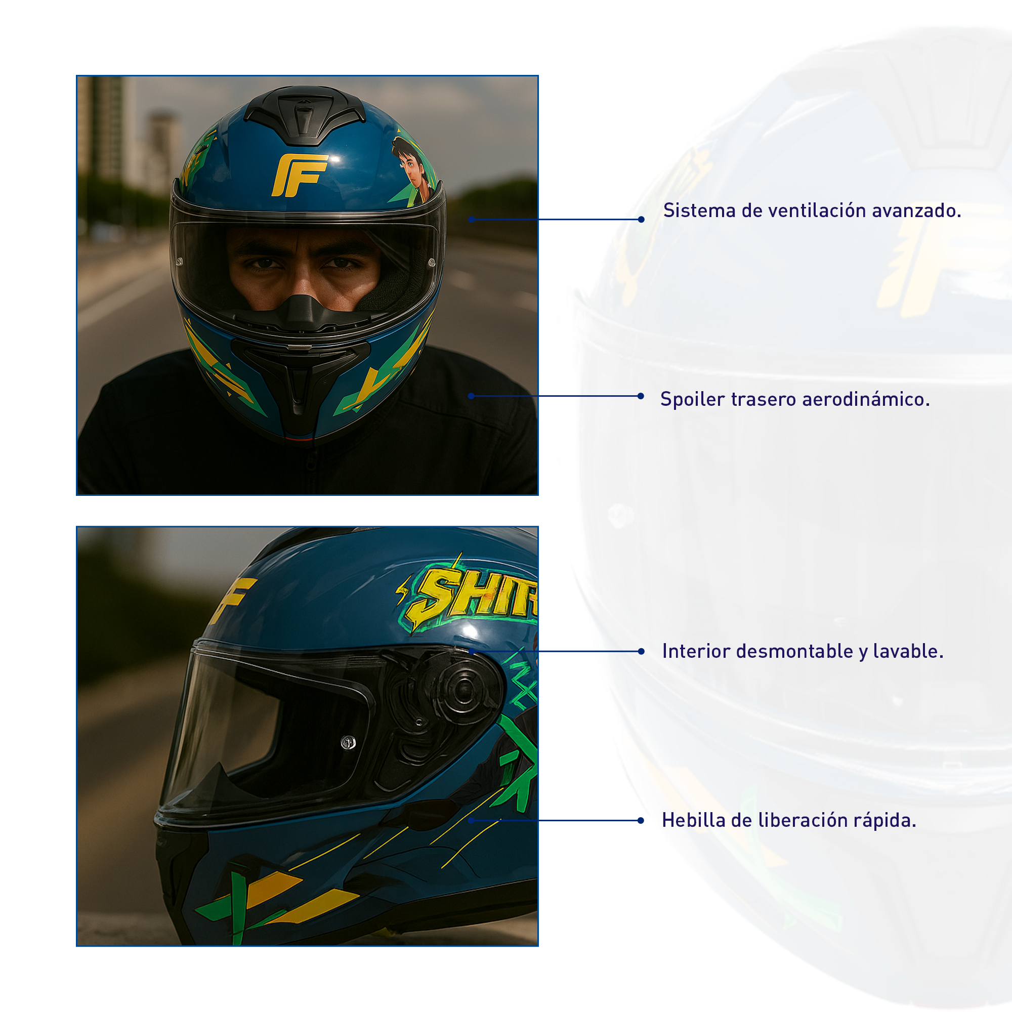 Proteger al motociclista con un casco integral abatible certificado, brindando seguridad, confort y visibilidad óptima en cada trayecto.