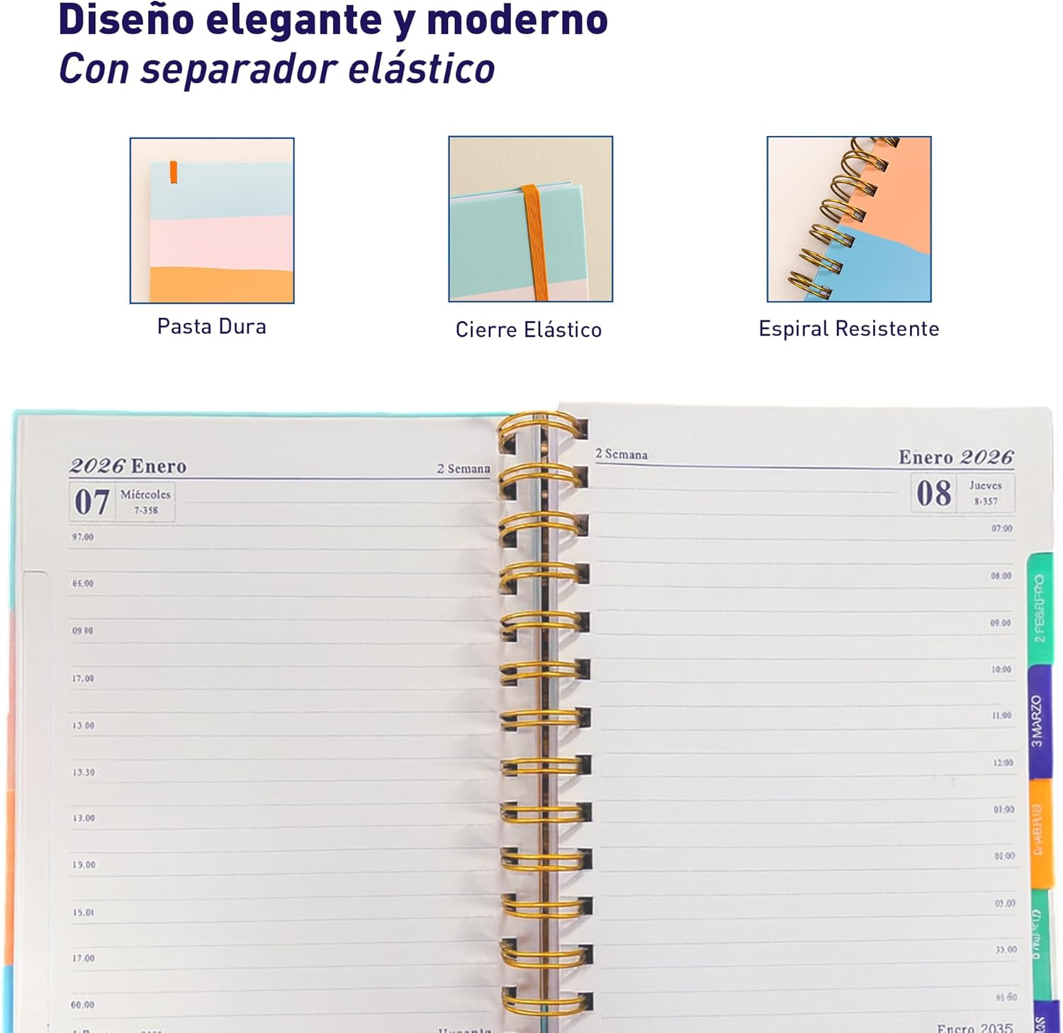 🎨 Diseño colorido y resistente: Pasta dura, espiral metálico y cierre elástico.