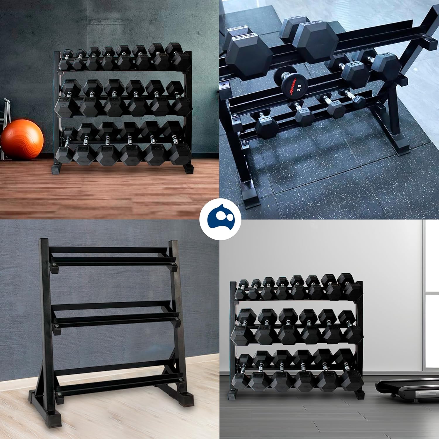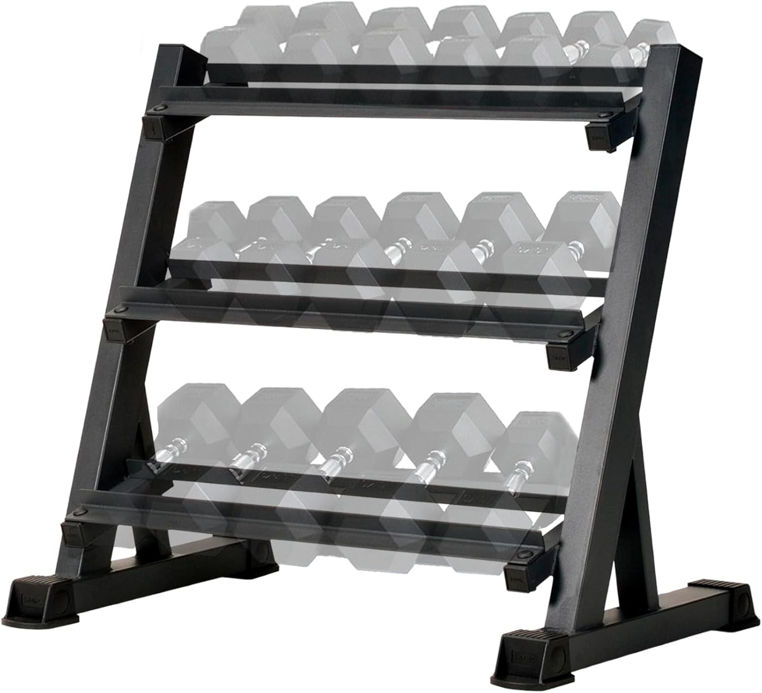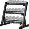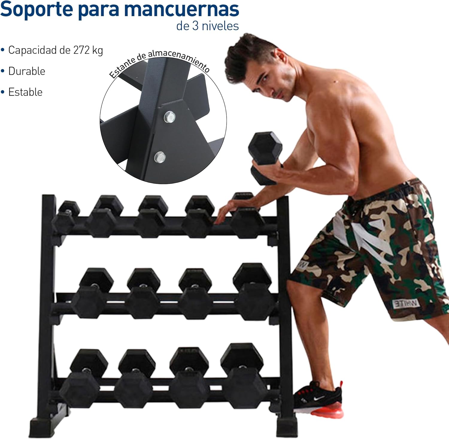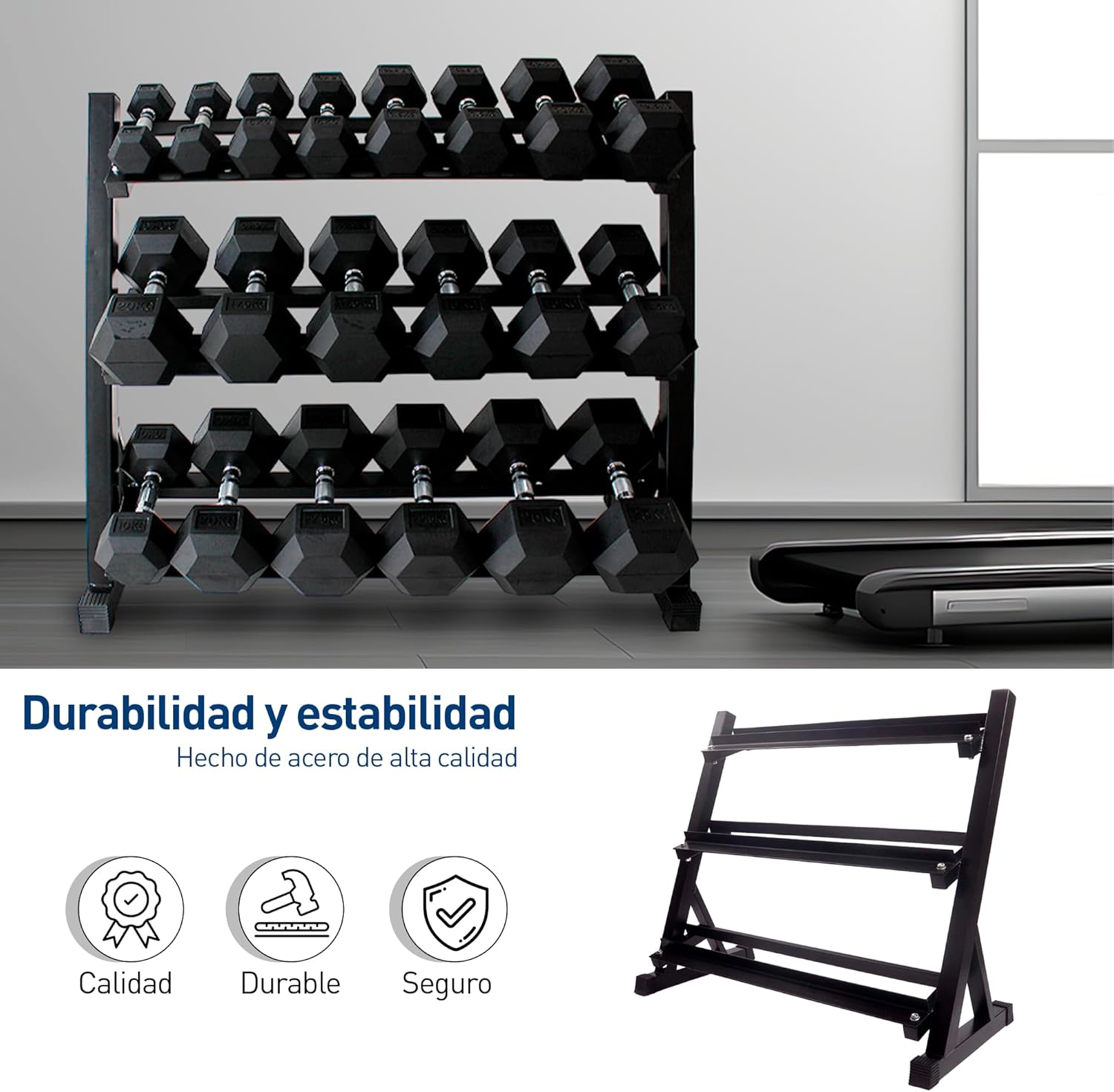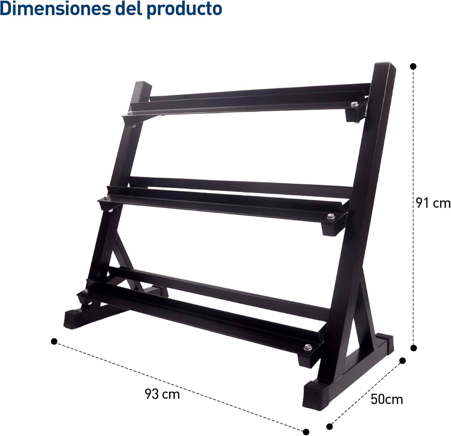 -Rack para mancuernas de 3 niveles (93 x 50 x 91 cm), con capacidad de 272 kg.