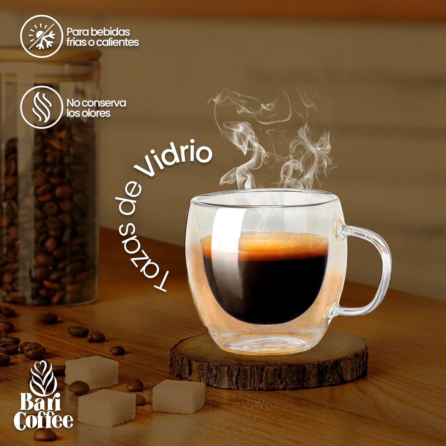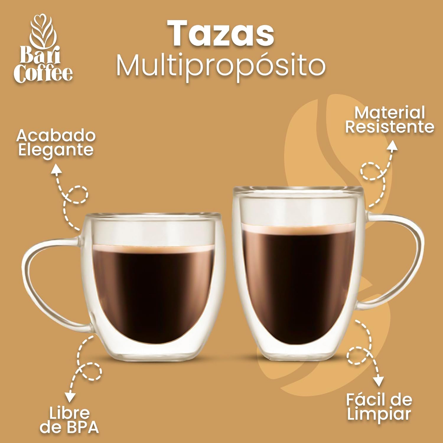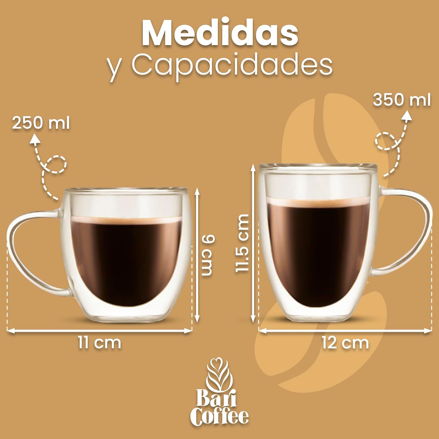 Incluye 4 tazas de cristal: 2 de 250 ml y 2 de 350 ml, ideal para quienes disfrutan el café con estilo.
